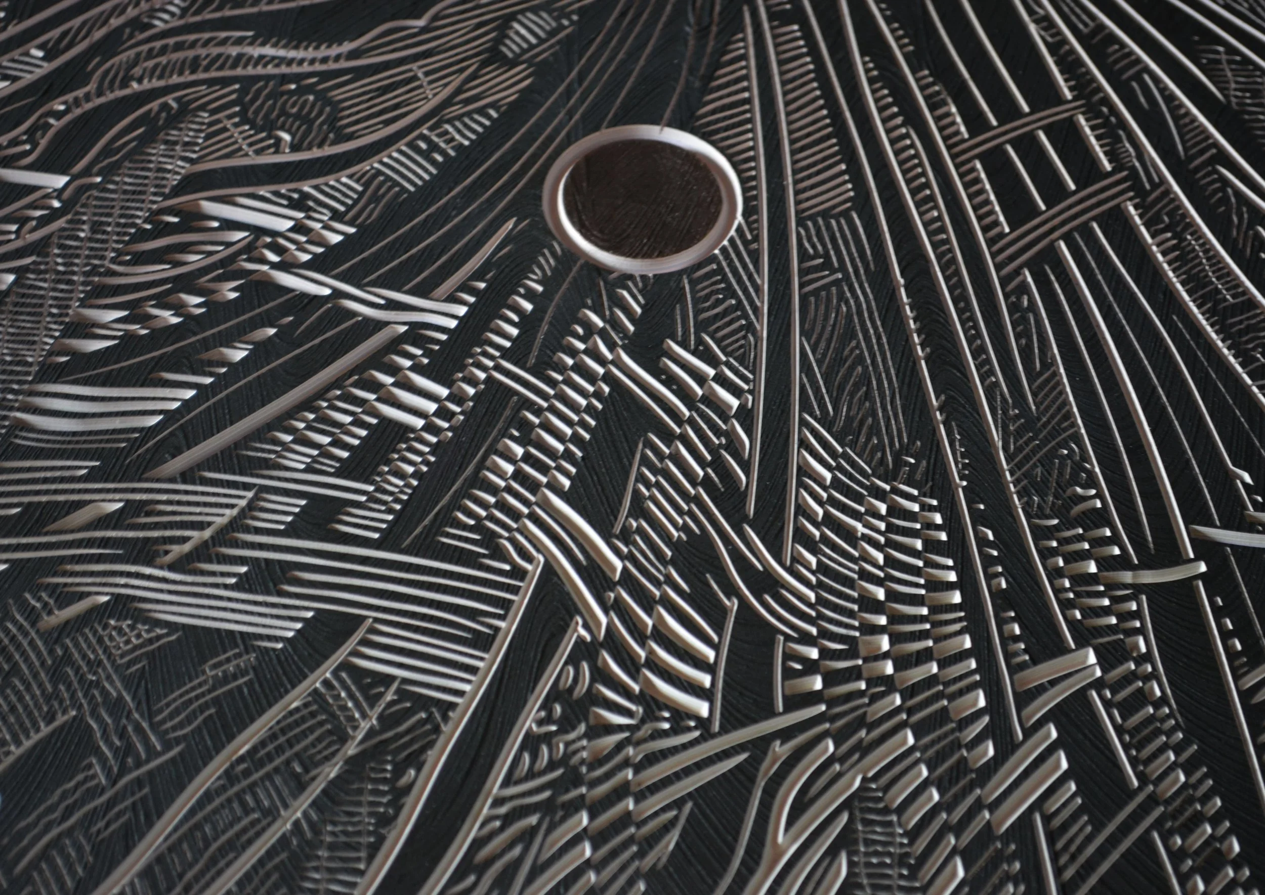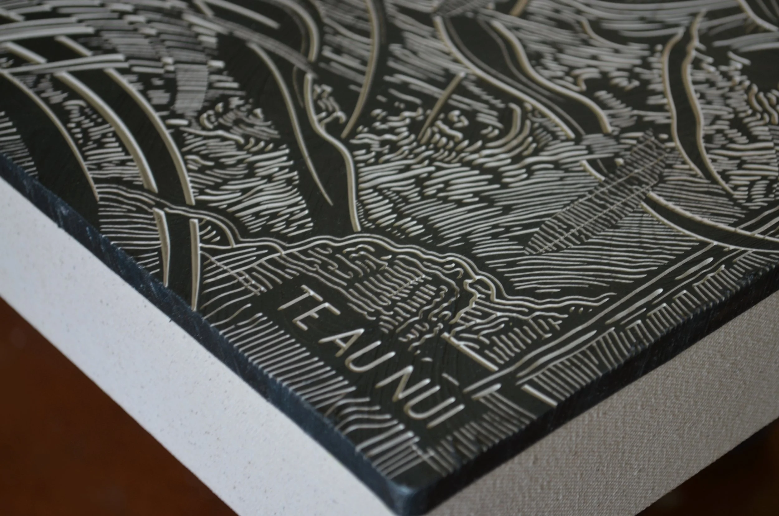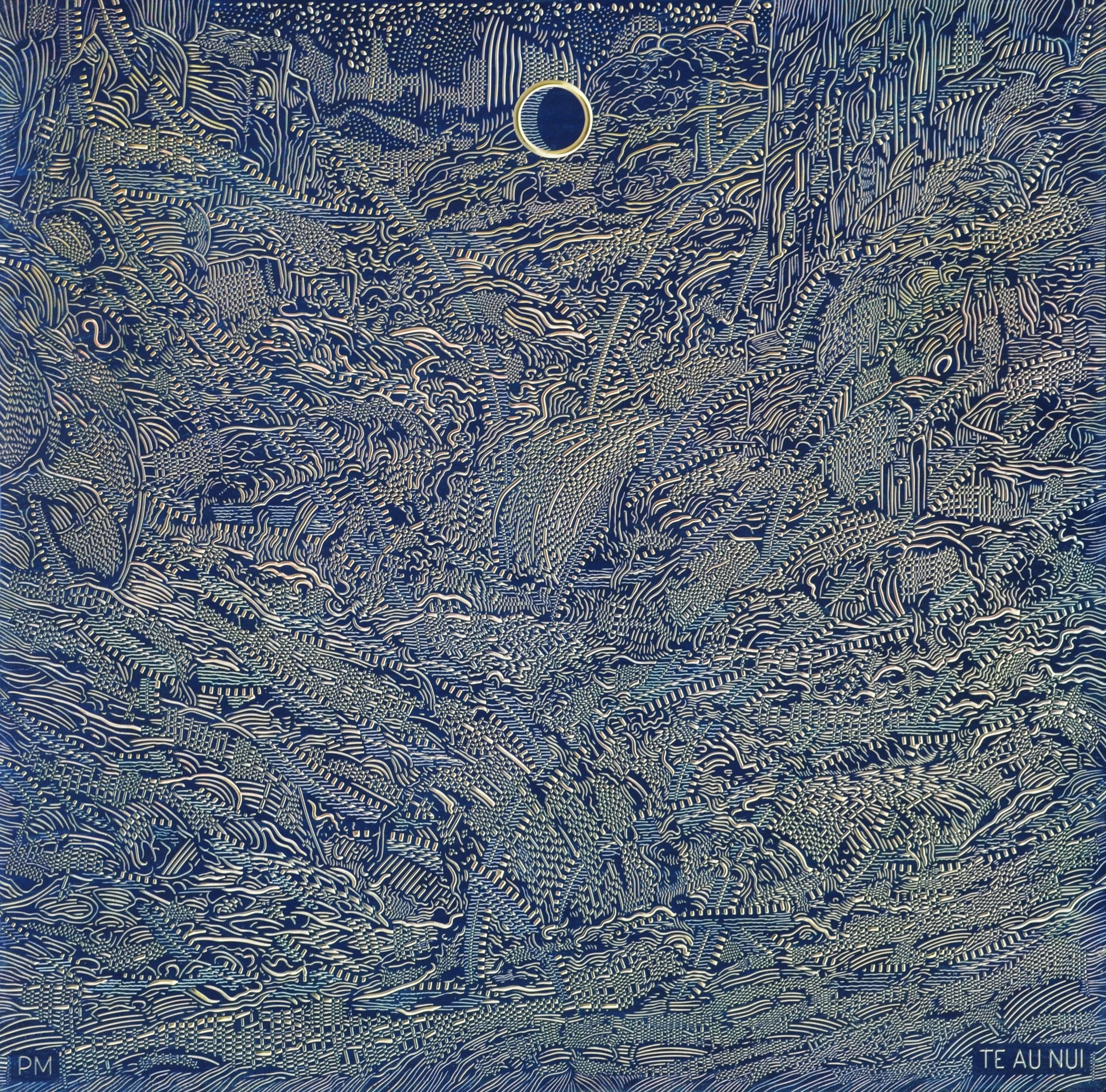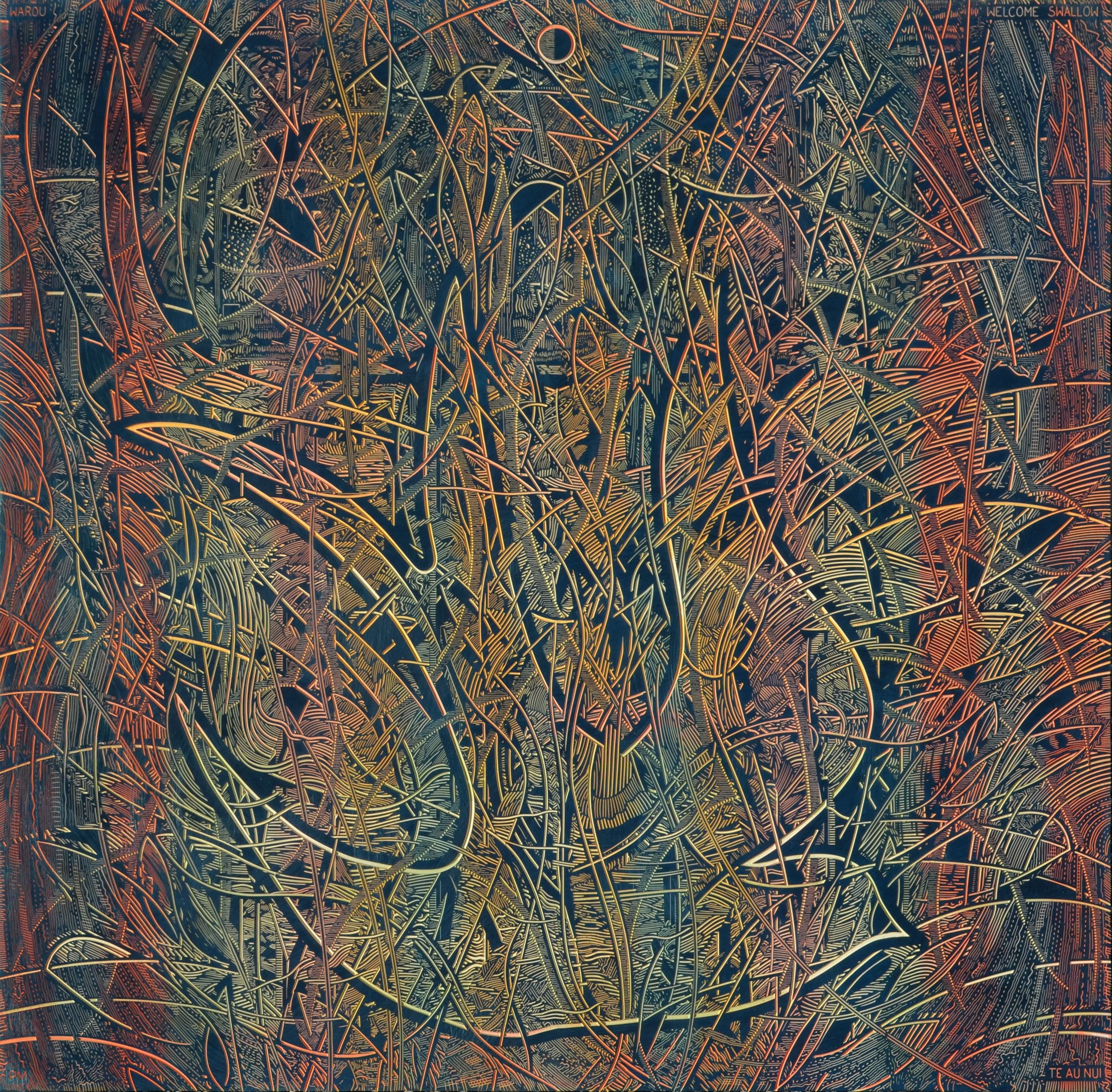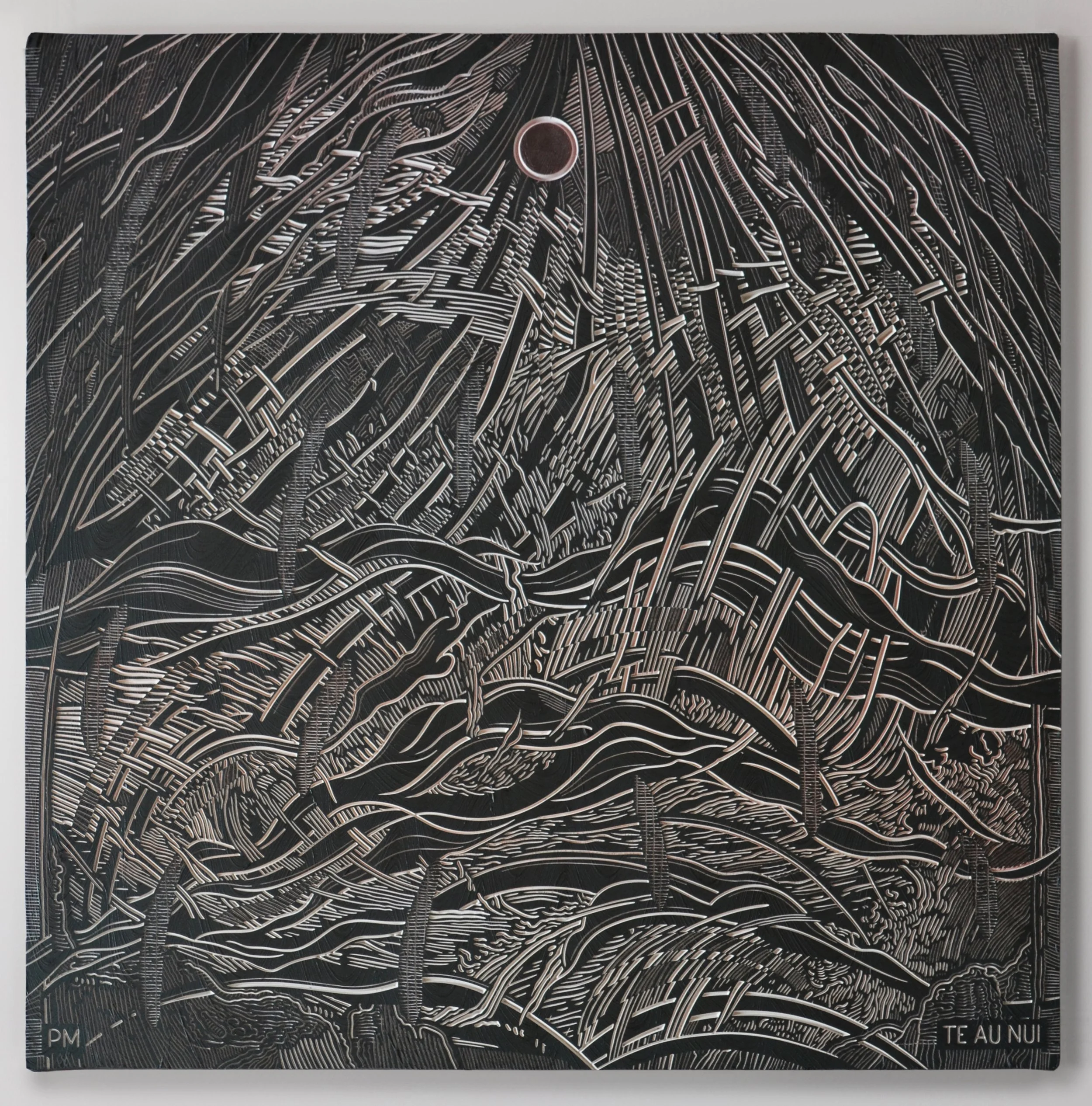 McLachlan’s studio overlooks the Mataura River. His creative process parallels the human history of the area, combining art, painting and carving machines to incise lines and carve surfaces that reflect a similarly enduring human imprint on the landscape. Te Au Nui draws us in with the aesthetic vision and asks us to contemplate how we shape the environment into the future at a deeper, mythic and spiritual level.